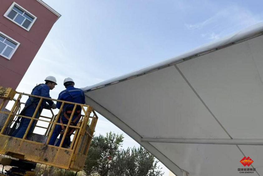 如果说钢结构框架搭建是一场挑战,那么防雨膜布的安装则是一次修行。尽管事先已针对膜布材质、安装工艺开展多轮研究学习,也模拟推演了高空作业、风力影响等各类潜在困难,但实际操作中,完成一整张200多平方米的膜布需在预制钢架上临空摊铺,其复杂程度和操作风险远非地面作业可比。队员们借助自制夹具和张紧工具逐步张拉,力度精准把控——过紧易撕裂膜布,过松则易积水影响使用寿命,最佳状态是敲击时能发出类似敲鼓的声响。最终耗时三天,整块膜布成功铺设完成。望着亲手打造的成果,机电队维修工张琦目光坚定:“我们离成功又近了一步,手疼是真的,喜悦也是发自内心的。”充电桩安装过程中,一场突发暴雨打乱了施工节奏。当时队员们正进行线路接线作业,天空骤然乌云密布,豆大的雨点毫无征兆地砸落下来。“快!关闭配电箱,遮盖好设备!”机电队副队长徐建海第一时间做出反应。雨停后,队员们第一时间排查设备,发现部分接线端子存在轻微受潮情况。为守住安全底线,他们先用热风枪对受潮部件进行处理,同时用专业仪器逐一检测线路绝缘性,直至确认所有设备均符合安全标准,才恢复接线作业。